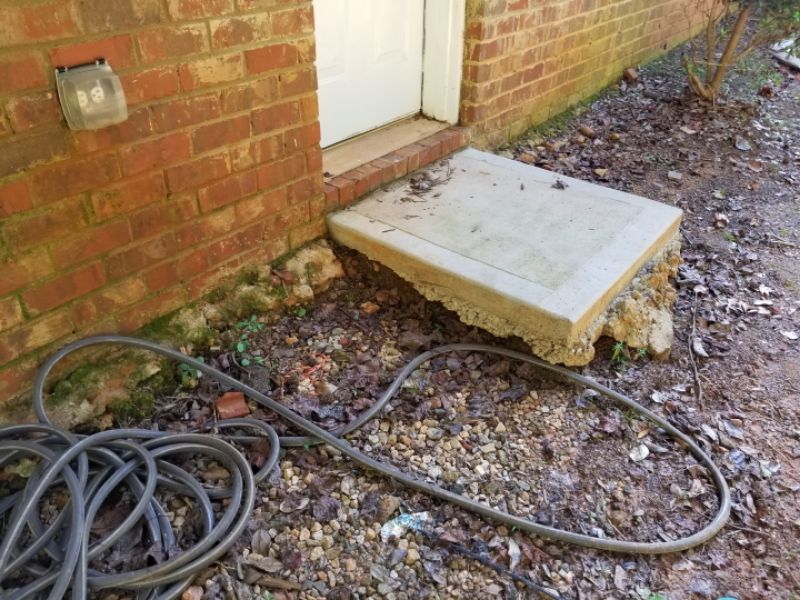 The grading is eroded next to the structure. This permits water to collect and penetrate the foundation. The cause of the erosion should be identified. Correct any issues causing the erosion, and regrade to divert surface water away from the foundation.